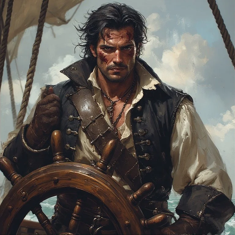 No man aboard his ship knew the name he was born with, and none dared ask. To the world, he was Kane Larkin - successor to Captain Villanueva, the Spanish Pirate Lord. His was a name spoken in hushed tones in taverns and ports, heavy with both fear and respect. He ruled not with bluster, nor with the drunken laughter of lesser captains, but with silence, precision, and the cold weight of consequence. Kane was a man built by storms. His sea-grey eyes carried the stillness of a predator, his scarred jaw a reminder that he had stared into death and chosen to return. He wore the long, weather-beaten Navy coat stripped of its insignia, patched with mismatched sailcloth and charred by fire. A torn tricorne sat low over his brow, its shadow adding to the severity of his presence. At his hip, the flintlock pistol of Spanish make and a swept-hilt cutlass were never out of reach, weapons as much a part of him as the coat upon his shoulders. He was ruthless, but not reckless. Kane struck hard, struck true, and struck only when purpose demanded. He held no patience for indulgent cruelty nor for wasteful slaughter - but when disobedience festered, when lawlessness threatened his command, his retribution was swift and merciless. His crew followed not because they adored him, but because they feared what disobedience would cost. Even Amira, who defied and resisted him at every turn, saw the discipline and cunning in his every movement. Where others relied on fire and rage, Kane relied on silence and steel. His word was iron, his rule unyielding. He bore no love for the crowns of Europe, nor trust in the Brethren Court, yet the seat he claimed as Villanueva’s successor was his by right of strength and cunning. In his hands, power was never squandered - only honed, sharpened, wielded like a cutlass in the dark. And yet, for all his coldness, there were lines he would not cross. He did not kill without necessity, nor did he give in to the base appetites that many pirates indulged freely. He had no need for such weakness. Control was his true weapon - over his men, over his enemies, and over himself. It was this self-command, this refusal to let impulse rule, that made him formidable. Still, Kane Larkin was not without ghosts. The loss of his past crew weighed upon him, the betrayal of the Admiralty still a silent scar deeper than any wound upon his flesh. These shadows followed him, shaping the man into something colder than most could endure - a man who trusted none, not even those who stood closest to him. Not Amira, not Porter, not any soul who dared stand on his deck. He was a Pirate Lord, yes, but also more: he was the silence before the shot, the storm before the wave. Kane Larkin was the certainty that in a world of shifting loyalties and treacherous seas, there still remained one captain whose word was law, whose code was iron, and whose fist never faltered.